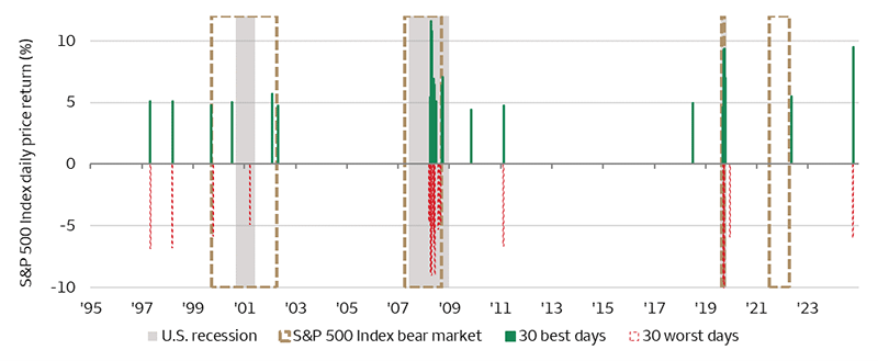 Our analysis shows that historically the best days in the S&P 500 Index tend to cluster in the midst of a bear market or recession, when the market is at its most volatile. Additionally, some of the worst days have occurred during bull markets. Of the 10 best trading days in terms of percentage gains, nine took place during recessions and six also coincided with a bear market, with three of those in the 2020 recession and the remaining days during the Great Recession of 2007 – 2009. Only one of the best trading days over the past 30 years (April 9, 2025) occurred during a bull-market correction. History suggests that disentangling the best and worst days can be quite difficult because they have often occurred in a very tight time frame, sometimes even on consecutive trading days. In our view, these findings argue strongly for most investors to remain invested in the equity markets, even during periods of high volatility.